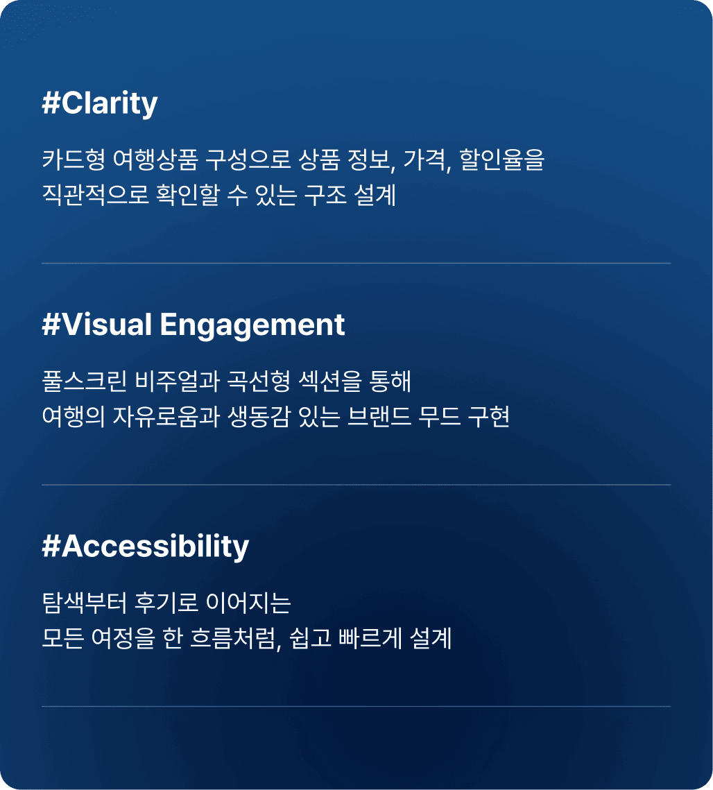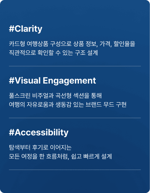 또한 둥근 카드형 상품 UI와 파스텔 블루 포인트 컬러를 사용하여 여행의 ‘가벼움’과 ‘개방감’을 동시에 전달했습니다.